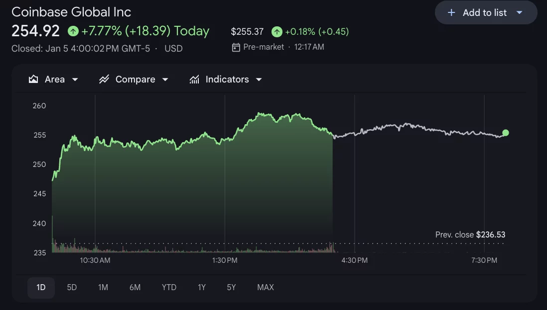截稿时,COIN交易价格为254.92美元,1月5日涨幅达7.77%。该股年内迄今已上涨近11%。