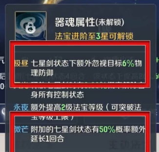主动法宝:七星剑,器魂选择极昼或微茫;另一个选五彩霞衣