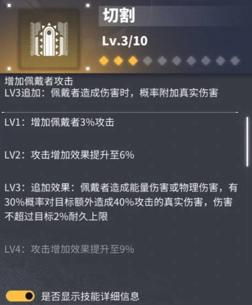 2、LV3追加效果为佩戴者造成能量伤害或物理伤害,有概率对目标额外造成真实伤害。