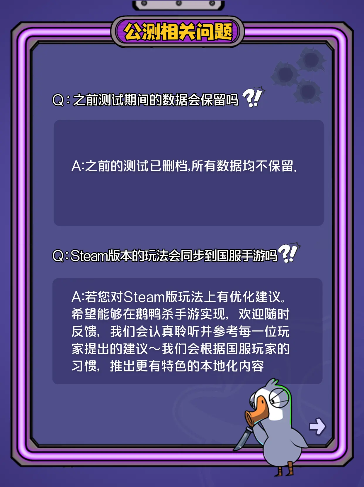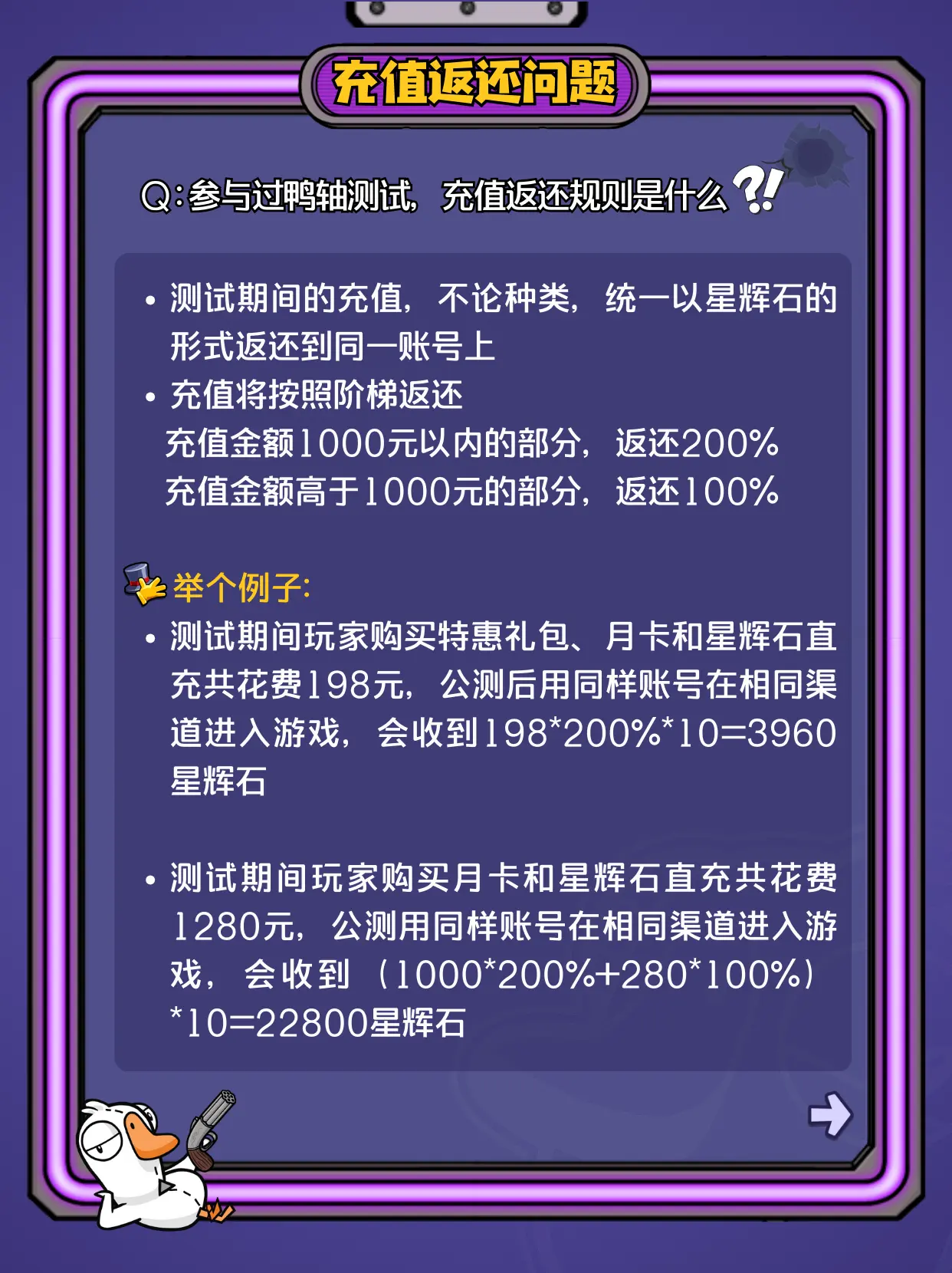 各位幸运鹅,《鹅鸭杀》公测定档1月7日!乐园探险即将启程。针对测试充值返还及公测常见疑问,官方已整理一份详细Q&A,欢迎查阅。