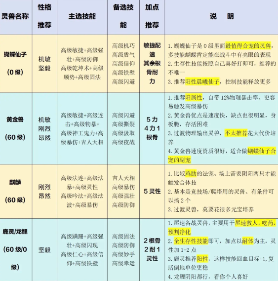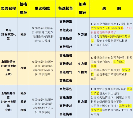 灵兽大冒险中各个灵兽都有其适配的主选技能,例如龙马主选技能推荐高级物暴+高级物伤+高级神工鬼力+高级偷袭+高级物连+吉人天相;血耐孙悟空主选技能推荐高级物暴+高级神工鬼力+高级物连+高级强壮+高级汲取+高级防御。其他各个灵兽宠物的推荐技能选择见下文详情!