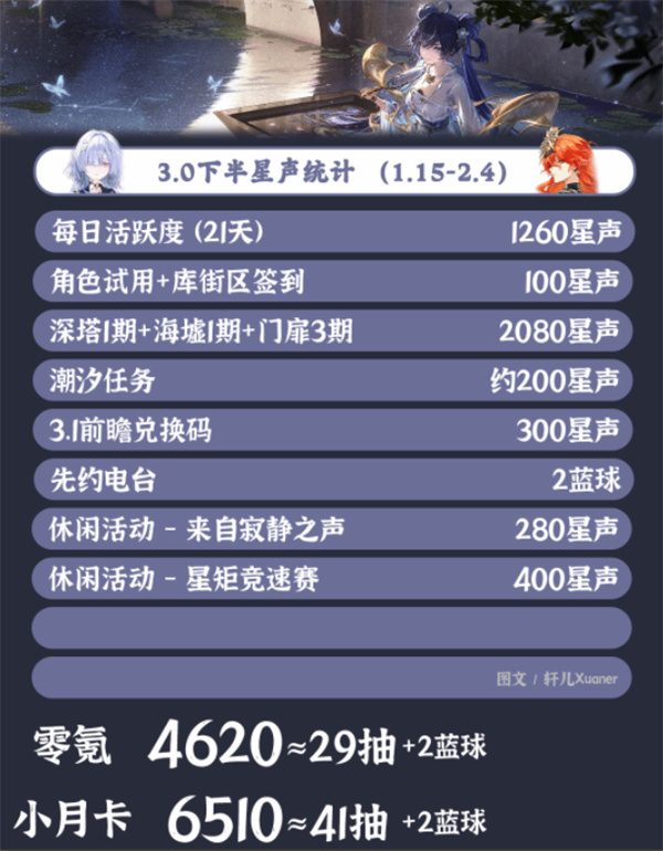 3.0下半从1月15日开始,截至版本结束,该阶段玩家可单独获得一批固定星声资源: