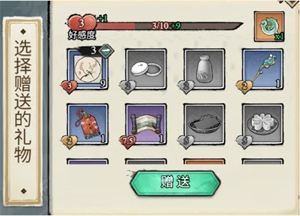 1、首先,通过向这些侠客【赠礼】的方式,提升与侠客的好感度——礼物可以在地图中拾取,或者在商人处购买。