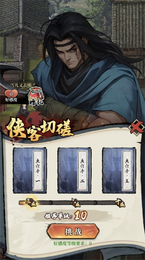2、好感度对应他挑战你的功力,与侠客的好感度越高,他将用越高的功力与你【切磋】,从三成功力到六成功力到十成功力逐步挑战。