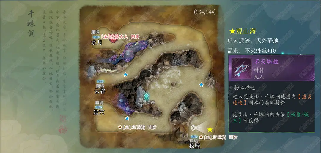 问山海花果山地图中有各种物品产出,例如五彩石碎片,可以提升炼妖葫,还有不周山石。击杀BOSS还可以掉落鸿蒙宝玉、地·海灵、混沌青莲等等。这里为大家收集整理了游戏中花果山地图里所有的BOSS以及各个灵气点宝箱获取的位置路线方法!