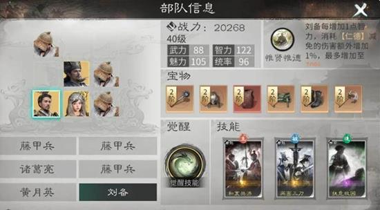 当刘备完成觉醒后,将解锁强大的主动技能桃园结义。释放该技能可以瞬间获得大量仁德层数,并为当前兵力最低的友方武将施加“结义”状态。处于结义关系中的两名单位会共同分摊所受到的全部伤害,这相当于为团队提供了极强的单体伤害减免能力,有效保护核心输出或主将的生存。