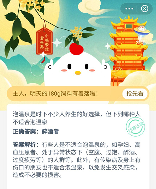 随着冬天的来临,有超多伙伴都喜欢上了泡温泉,在今天的支付宝小鸡答题中就会就问到大家这个问题,有一些人是不能泡温泉的哦,小伙伴们知道是哪些人吗,下面一起来和看看正确答案吧。