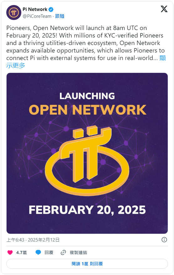Pi Network 开放网络将于2025 年2 月20 日启动。