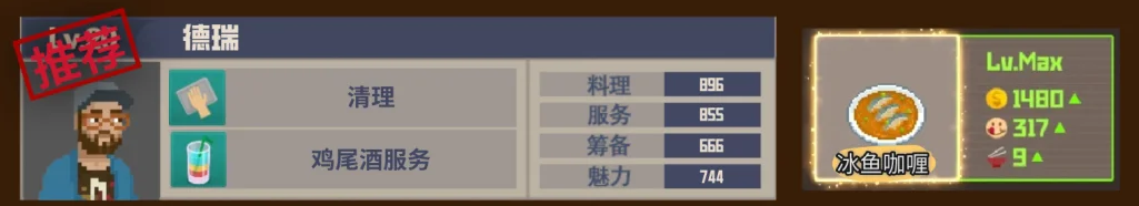潜水员戴夫厨房中推荐的员工有米仓、真纪、詹姆斯、拉乌尔;大堂中推荐的员工有埃尔尼诺、猛禽、比利、树;派遣推荐的员工有达比纳、正义;经理推荐的员工是德瑞。