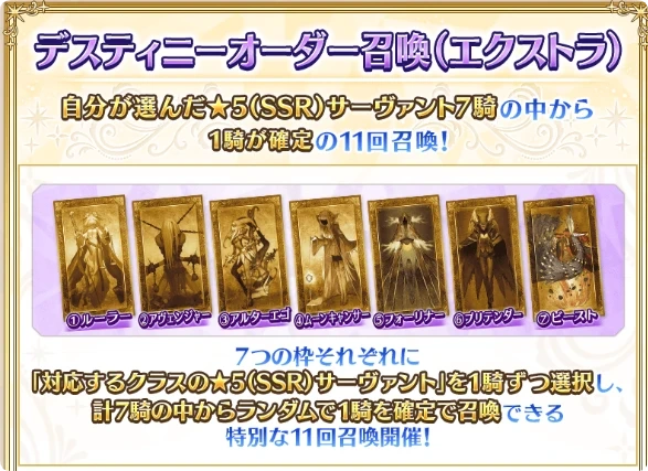 购买之后,在对应福袋的7个职阶里面分别选出一个自己想要的五星,职阶内的所有从者都能选,包括常驻,特殊职阶也能选兽阶,但是新实装的奥尔加玛丽不能选。