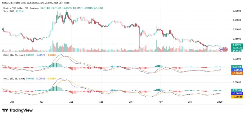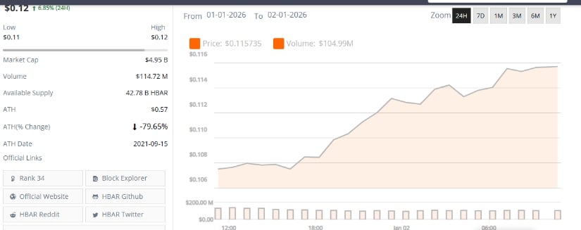 日线图表显示,HBAR呈现强劲上涨趋势,价格从0.106美元攀升至0.116美元区间,单日涨幅达6.85%。