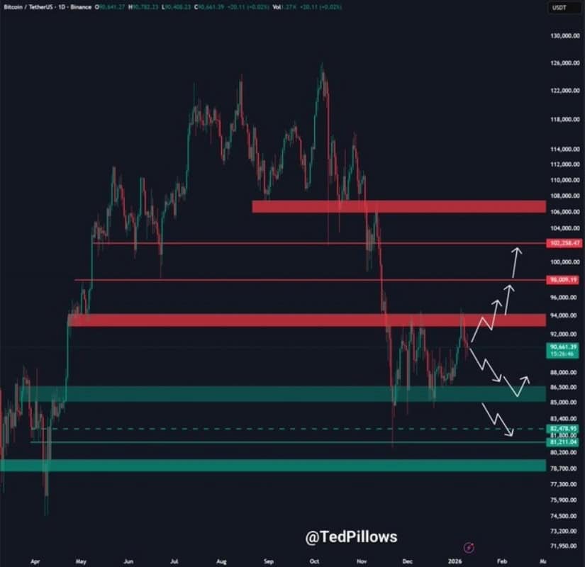 比特币在92,000美元附近挣扎,下一步取决于能否突破阻力或测试88,000美元支撑。来源:@TedPillows via X