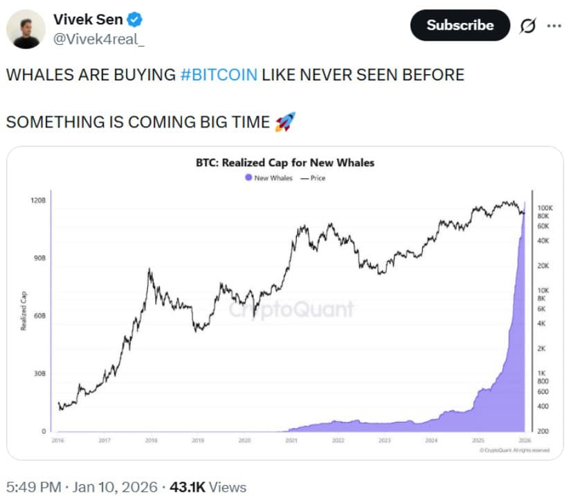 尽管价格走势犹豫不决,链上指标却描绘出更复杂的图景。CryptoQuant追踪持有超1,000枚BTC且持仓时间少于155天的新巨鲸实体数据显示,已实现市值正急剧攀升至近1,200亿美元。