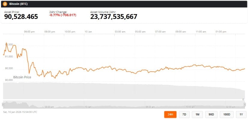 截至发稿,比特币报价90,528美元,24小时跌幅0.77%。来源:Brave New Coin比特币价格指数