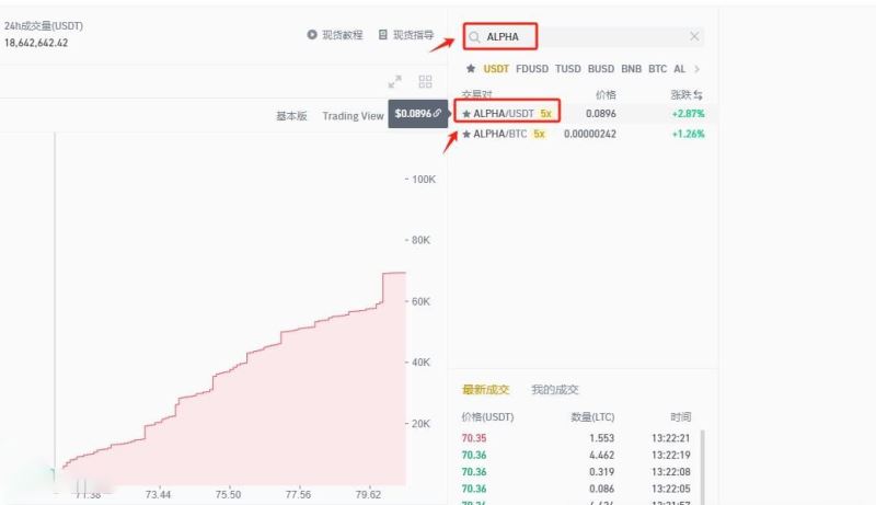 7、搜索币种简称【ALPHA】,选择【ALPHA/USDT】交易对