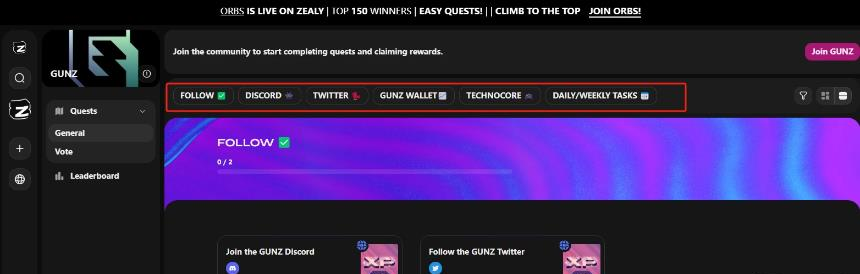 除了币安 Launchpool 的质押挖旷任务外,GUNZ 官推于本月 25 日宣布集成 Zealy,玩家可通过完成任务获得代币奖励。任务类型包括社交任务、GUNZ 钱袋任务和访问游戏任务等。
