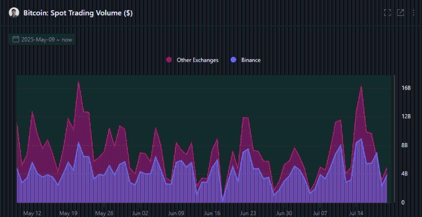 据链上分析公司 CryptoQuant 在其仪表板中发布的数据,随着比特币价格接近历史最高纪录(ATH),加密货币市场的现货交易量也发生了显著变化。