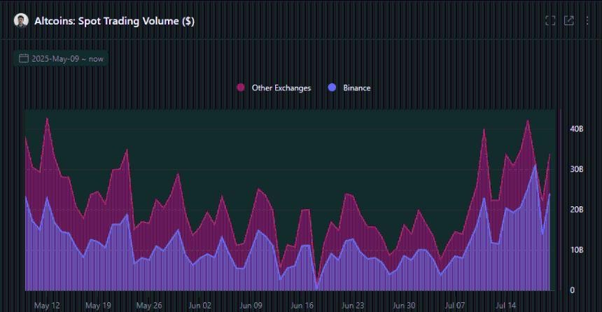 链上数据显示,在比特币价格近期上涨的推动下,山寨币交易量迎来了爆炸式增长,而币安在这波交易热潮中占据了最大的市场份额。
