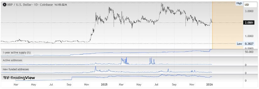 XRP大幅波动后进入盘整 链上活动活跃彰显网络参与度强劲或支撑价格稳定。来源:Cryptobingbong on TradingView