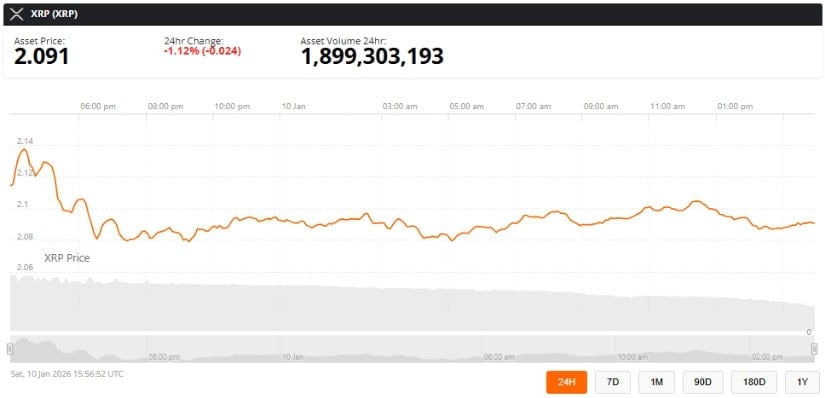 截至发稿,XRP报价2.09美元,24小时下跌1.12%。来源:Brave New Coin