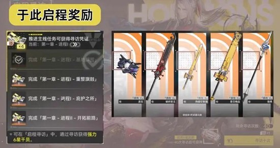 推进主线可以获得40抽寻访凭证,40抽内必出六星常驻角色,40抽后赠送自选6星武器箱。