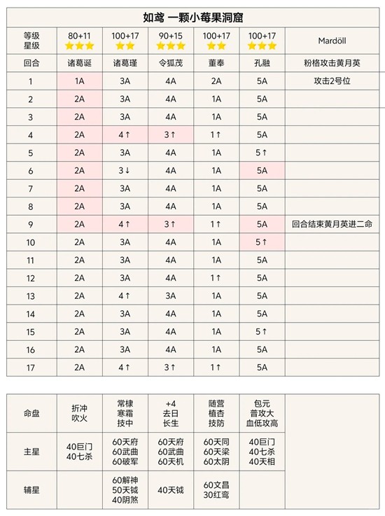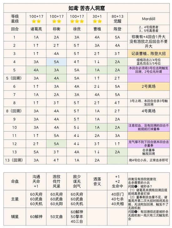 打法:利用诸葛亮的回溯机制(一局三次)保人保技能,曹植放大封董奉技能即可避免董奉回满血。21-27层都可9回合结束,28-30层13回合击杀董奉,留下小兵慢慢打