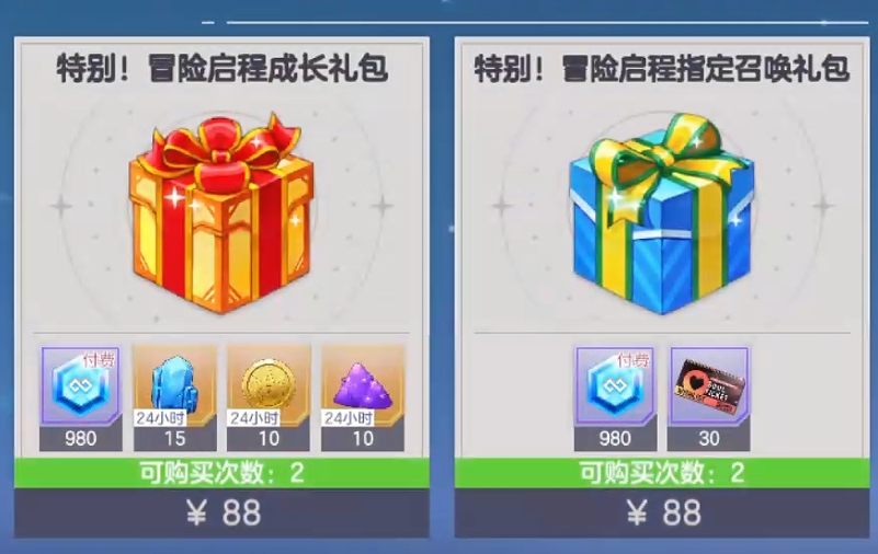 推荐优先级为:88元【冒险启程指定召唤礼包】与同价【冒险启程成长礼包】并列首选,其余同类产品依次靠后。