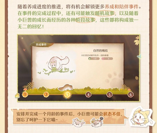每个月龄开始时,可以为小巨兽安排不同的事件,完成事件可获得相应属性和好感度。