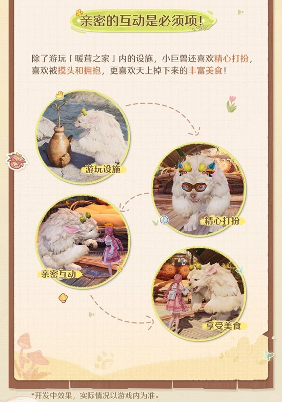 除了游玩「暖茸之家」内的设施,小巨兽还喜欢精心打扮,喜欢被摸头和拥抱,更喜欢天上掉下来的丰富美食!