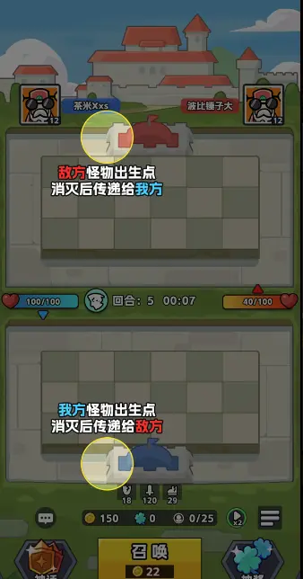 王者对决游戏战斗介绍,战斗界面上下方各有一个出怪口,每个回合持续出怪,怪物会按逆时针/顺时针在上下半区循环移动。