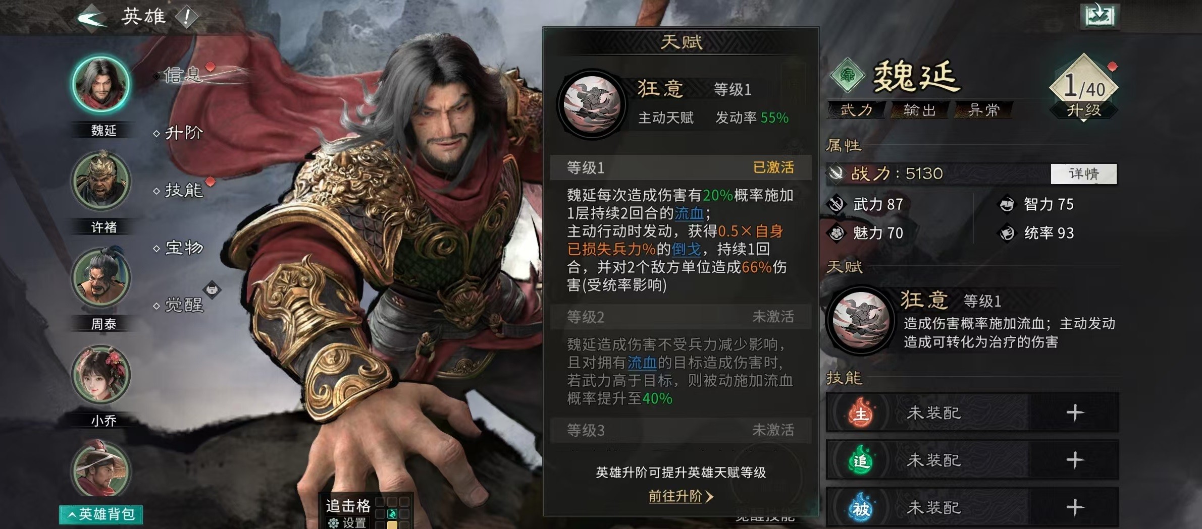 本期攻略将深入解析三国天下归心中魏延的实战定位与高阶运用策略。作为游戏中兼具爆发与持续压制能力的武力型核心输出武将,魏延凭借独特的“流血”机制,在当前版本中展现出极强的战术适配性与环境克制力,尤其在对抗高频行动类阵容时优势显著。
