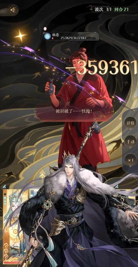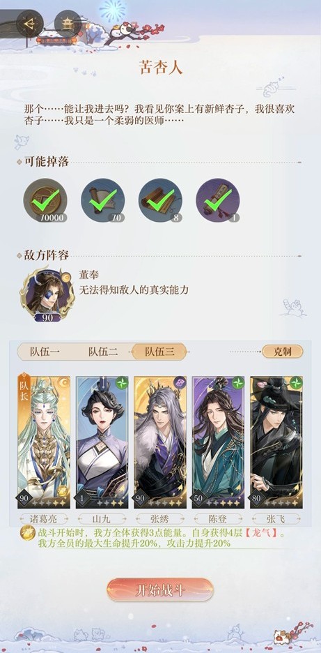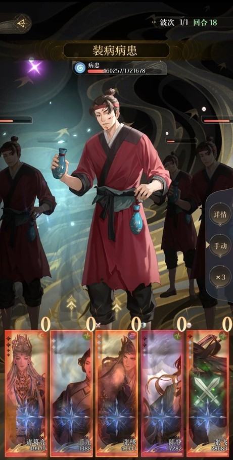 董奉退场后假病患会秒杀我方全体,这时候就需要诸葛亮的复活,之后在25回合内击败所有假病患即可