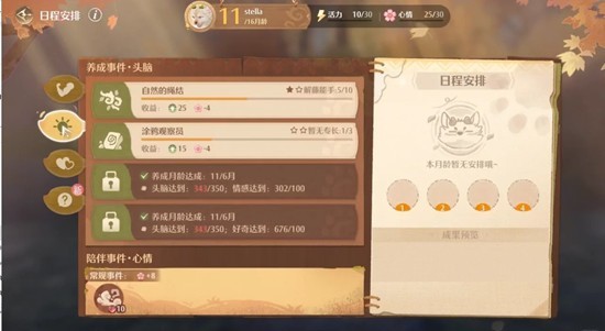 最后点日程安排,这个会消耗心情,心情不够用就选陪伴事件加心情。然后这个月就结束了,礼物能触发什么不知道,没用过。