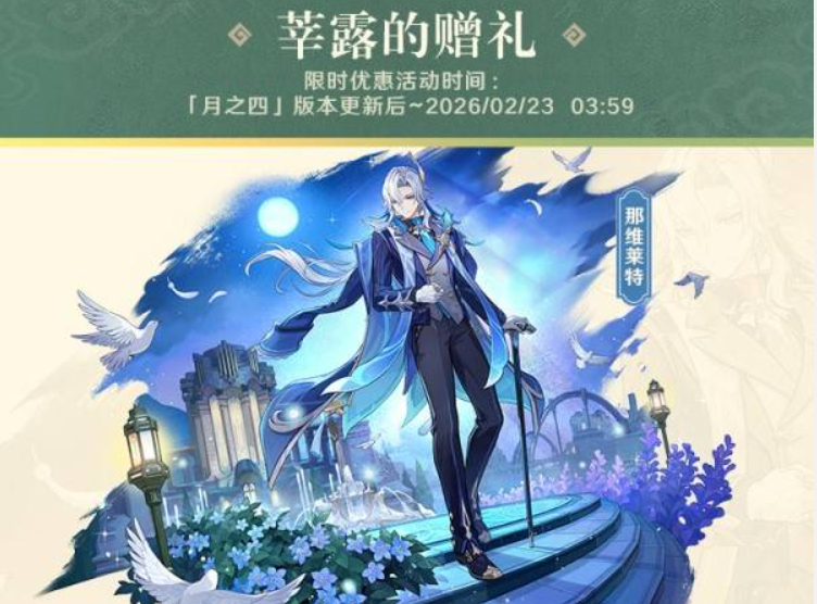 限时优惠活动时间:月之四版本更新后——2026/02/23 03:59期间,购买【莘露的赠礼】可享受限时折扣。折扣期间衣装售价为1350创世结晶,限时折扣结束后价格将恢复至1680创世结晶,上架期间限购1次