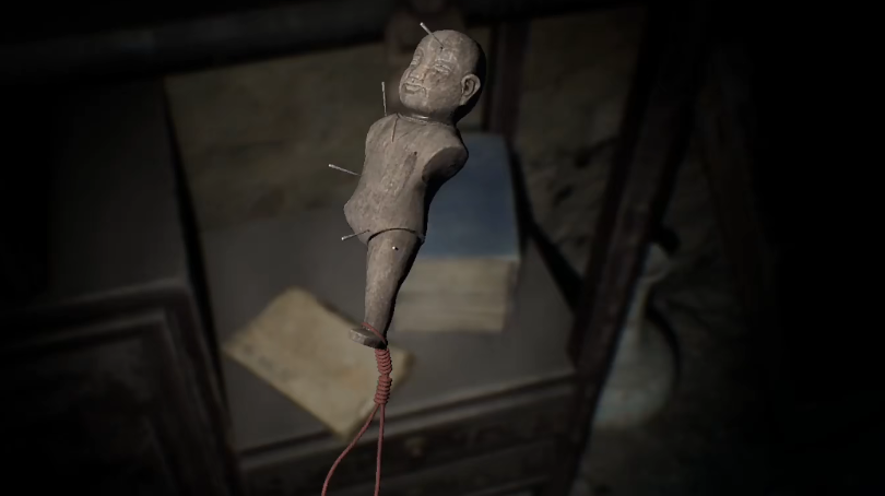 往里走,床对面的桌子上有个诅咒娃娃,捡起来。左边抽屉有火柴,中间抽屉有地图。
