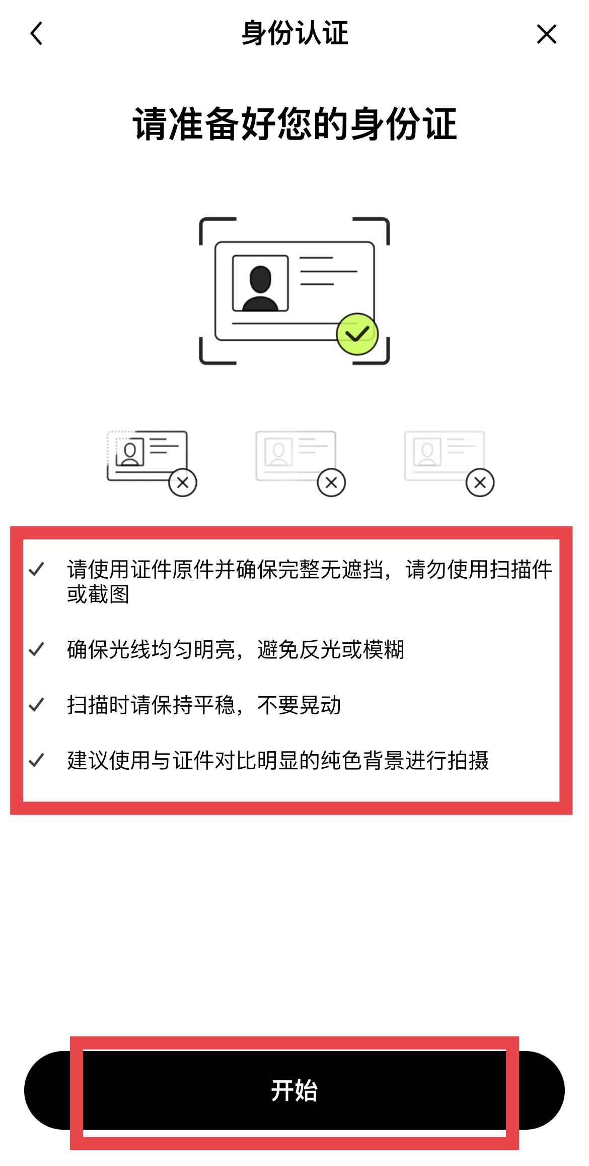 点击【开始】按钮,按照下方图片红框内要求拍摄身份件正反面,即可完成认证。