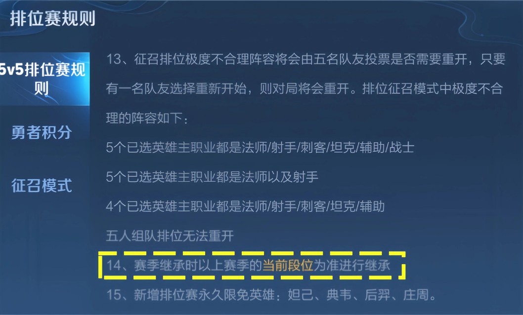 S42新赛季,与S41赛季排位段位继承规则有所不同,星耀及以上段位跌幅有所增加,会在之前规则的基础上再下降一个段位: