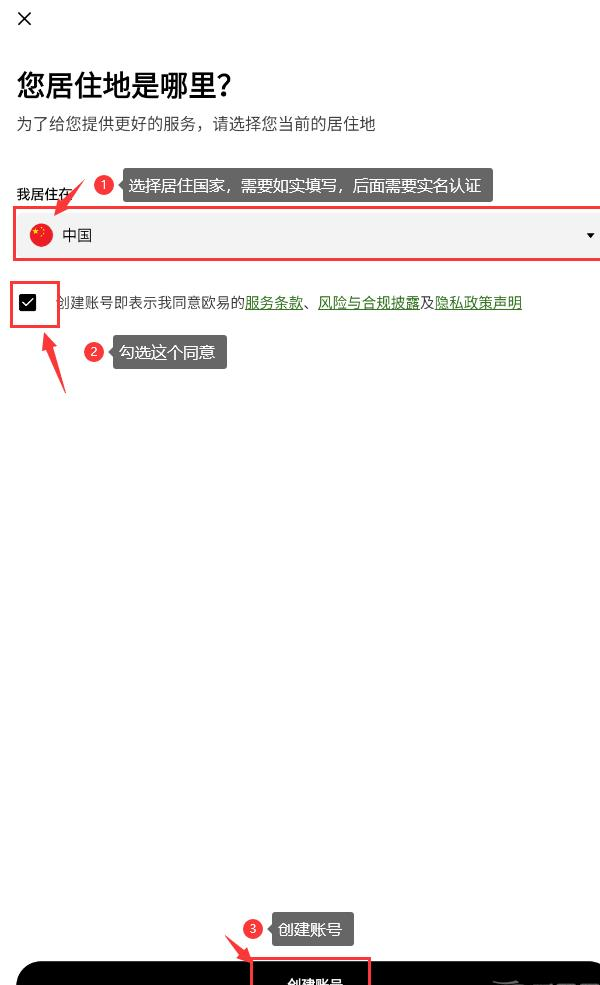 3、请确认您的居住地址与所选国家相符,这对于后续使用身份件件进行验证至关重要。