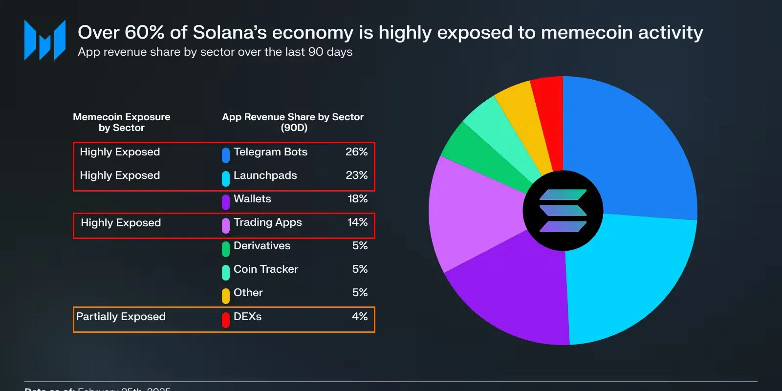 更关键的是,Solana的大部分链上活动都来自 Memecoin 热潮。数据显示,这类交易一度占其DEX交易量的50%以上。但 Memecoin 是一种短期、零和博弈型现象--热度过去后,其“高收入”神话也难以为继。