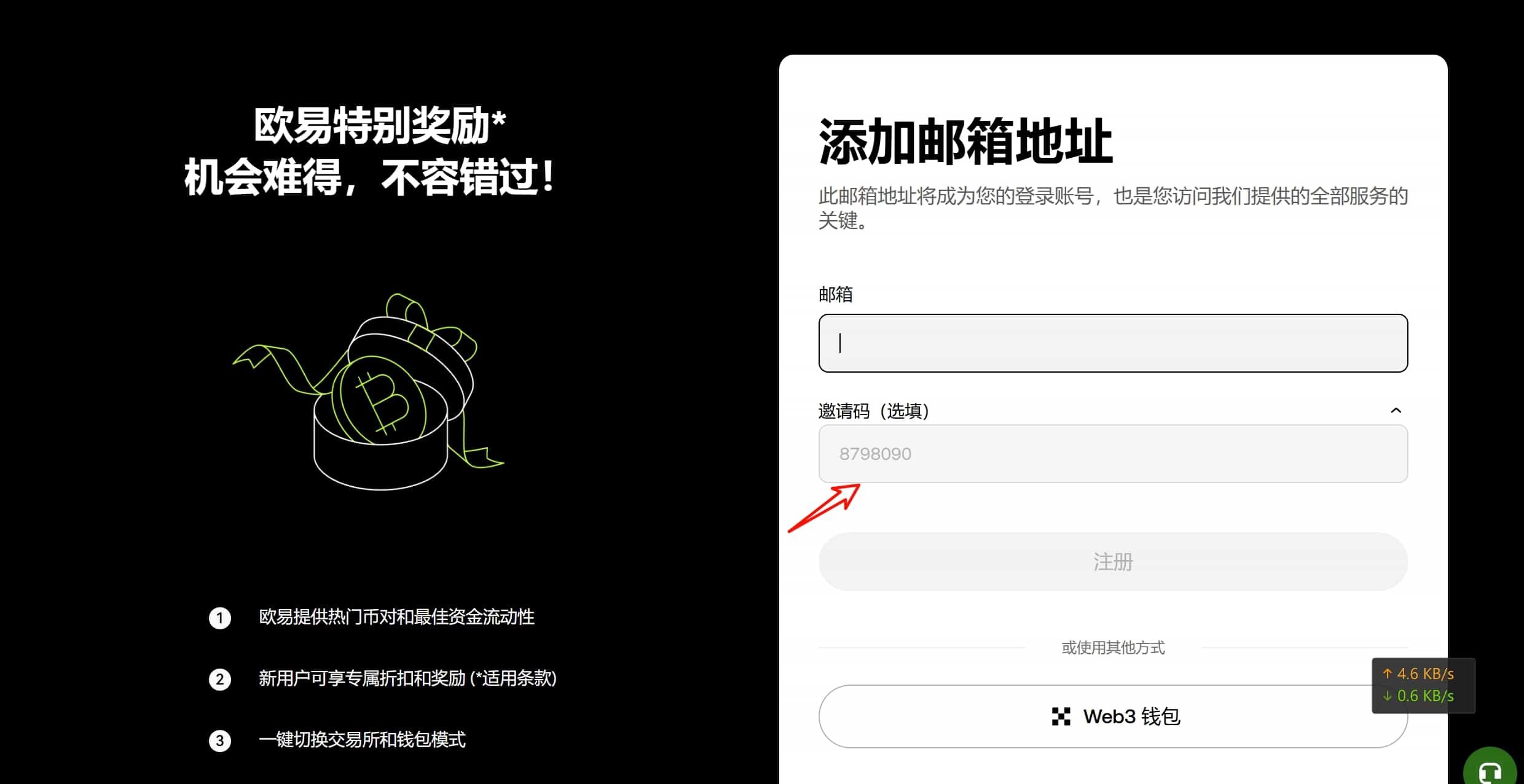 然后在注册页面输入我们的邮箱,输入好之后注意一下邀请码,如果你是从别的地方进来的话,你的邀请码有可能是空白的你可以把这个邀请码更改成RYE2025APK。如果它不让你改的话,建议你重新打开个网页或者是从我的链接进入。因为如果你邀请码填的不对,或者是他这个邀请码没有返现比例,后续你就不会享受很多的优惠了。然后我们点击【注册】。
