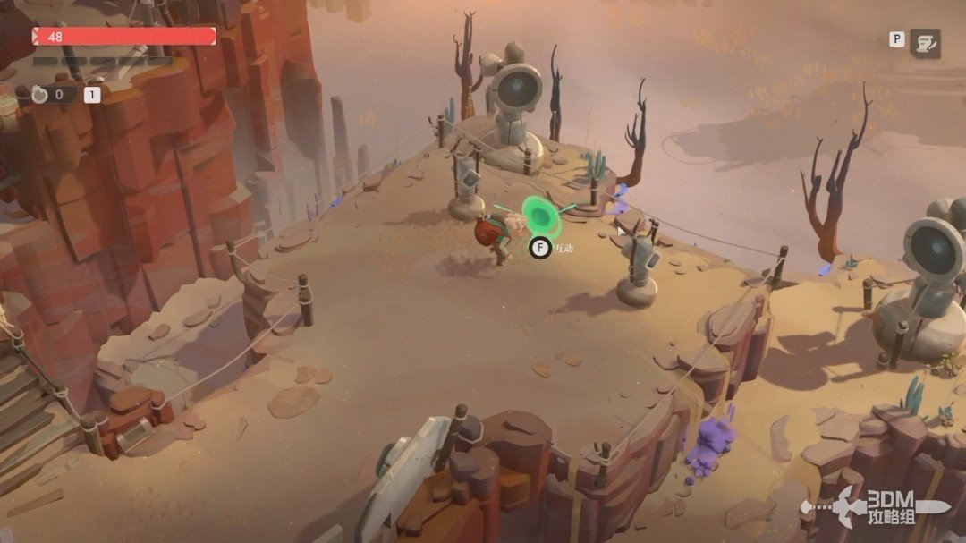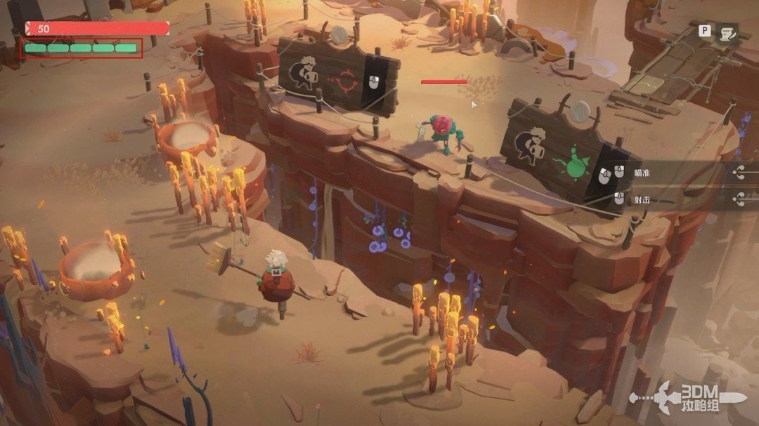 拿上遗物后继续往前走,前面会有敌人在对面。我们现在可以按住鼠标右键瞄准,然后按左键发动远程攻击,远程攻击需要消耗左上方的绿条。