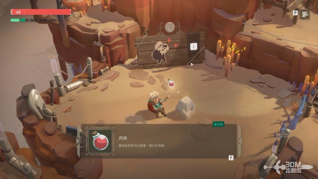 整理好背包,我们往前走能拿到药剂,按数字1可以恢复生命值,前期吃一次可以恢复20血。