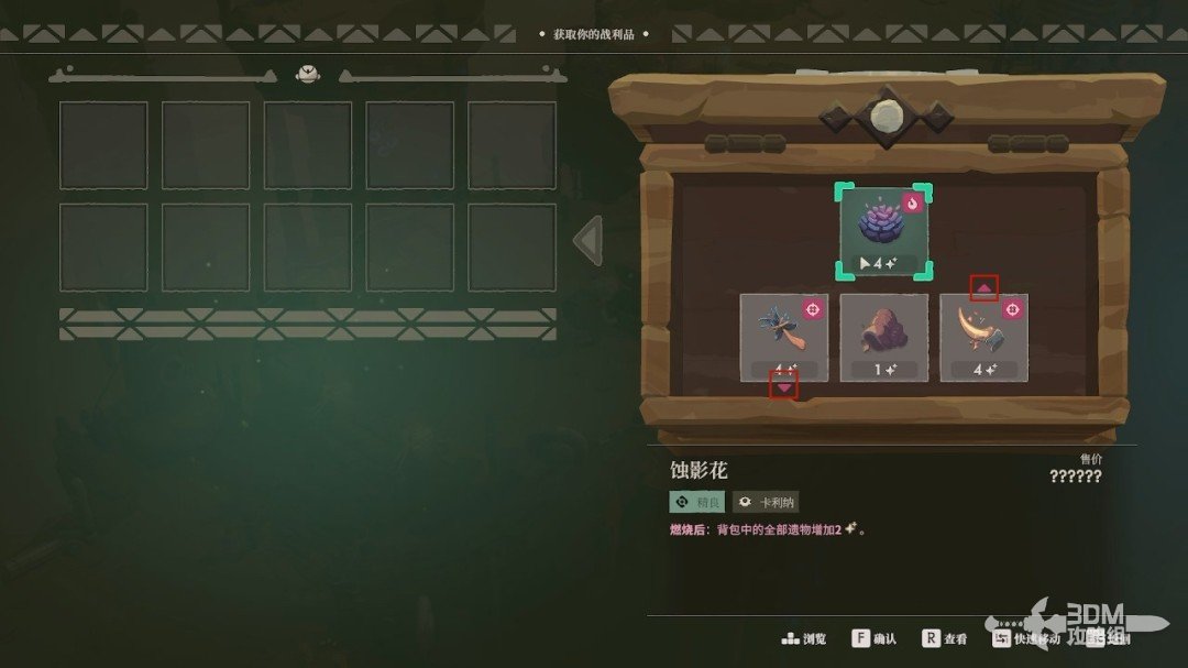 一些遗物的诅咒我们要灵活运用。比如这个“蚀影花”,它的特效是燃烧后给背包里的全部遗物增加品质,我们先把下面的三个全部移到左边。