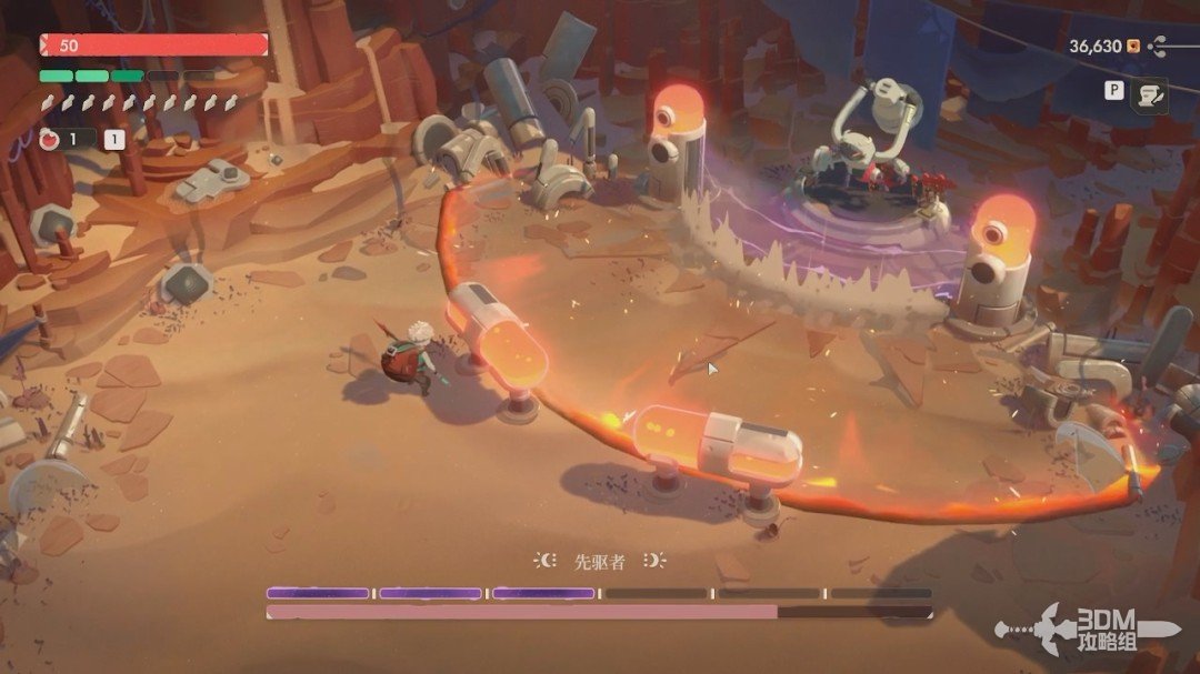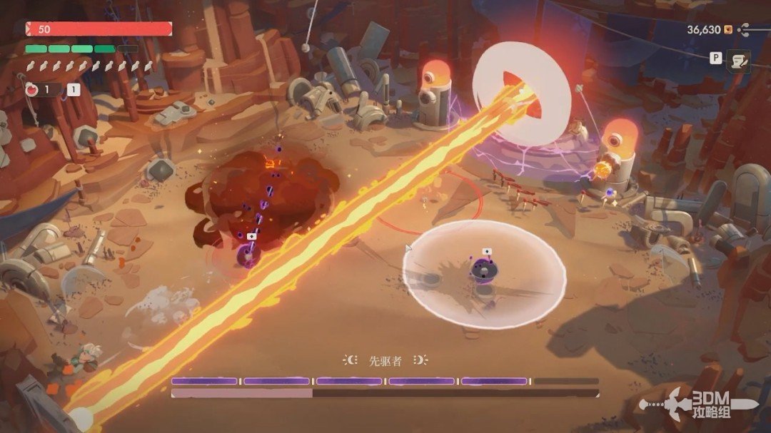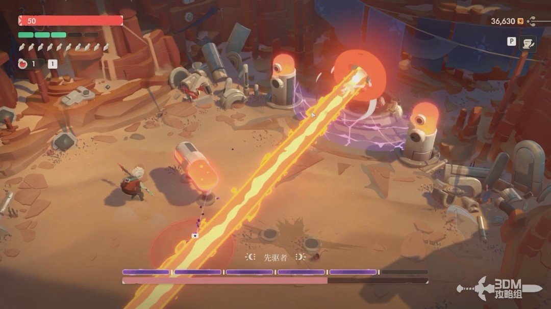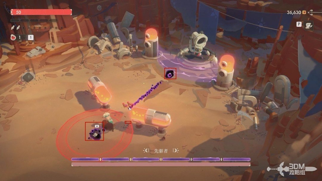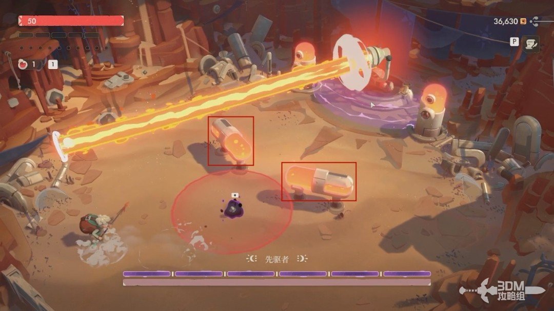 第一关的BOSS是先驱者。开局我们无法对它造成伤害,它有紫盾。我们先躲避它从天上抛下的炸弹和激光,激光站在这两个罐子后面躲避。