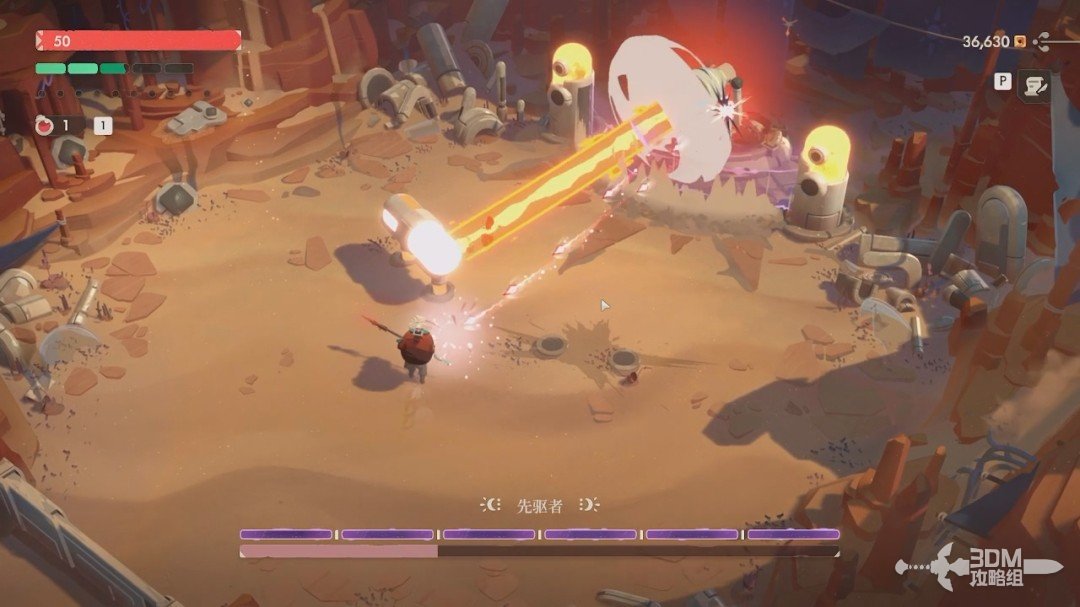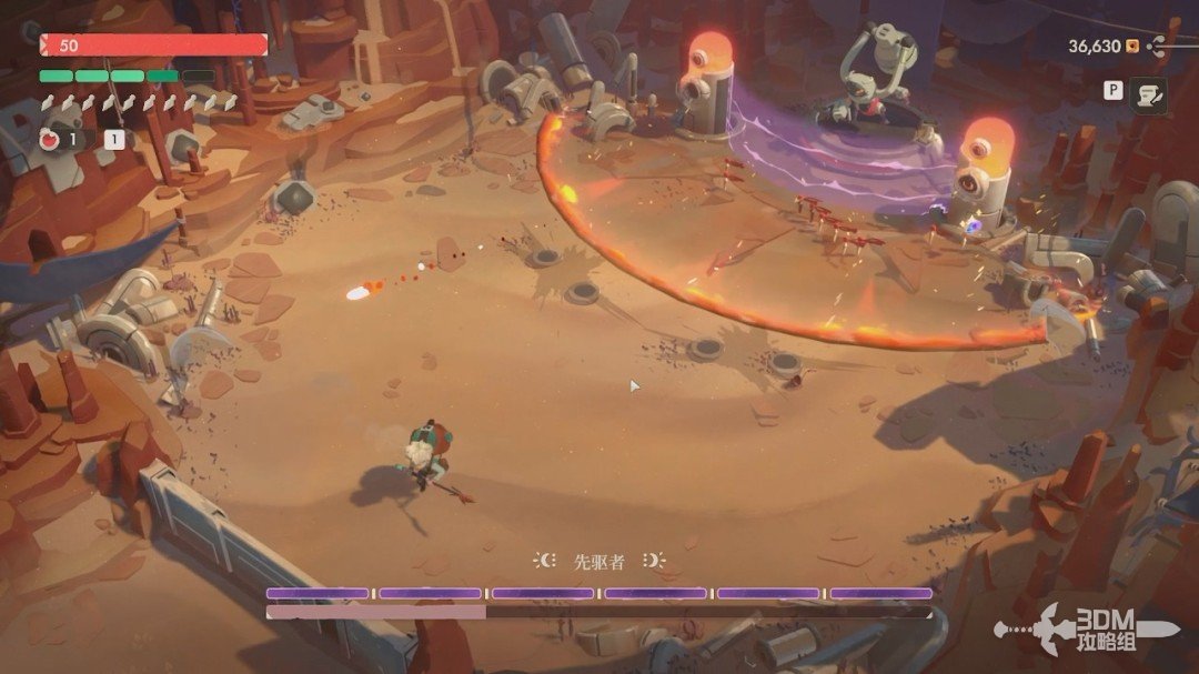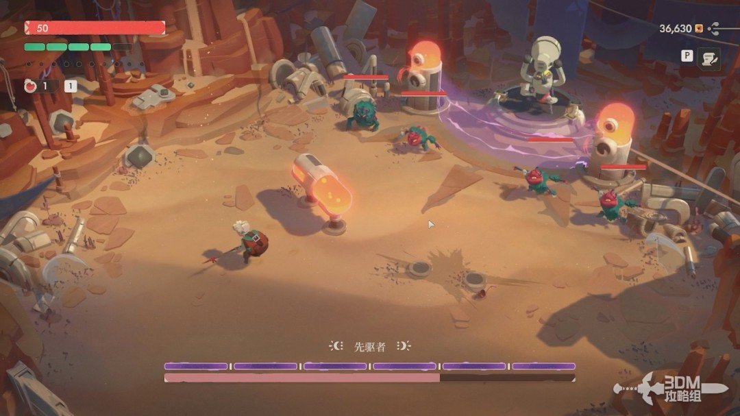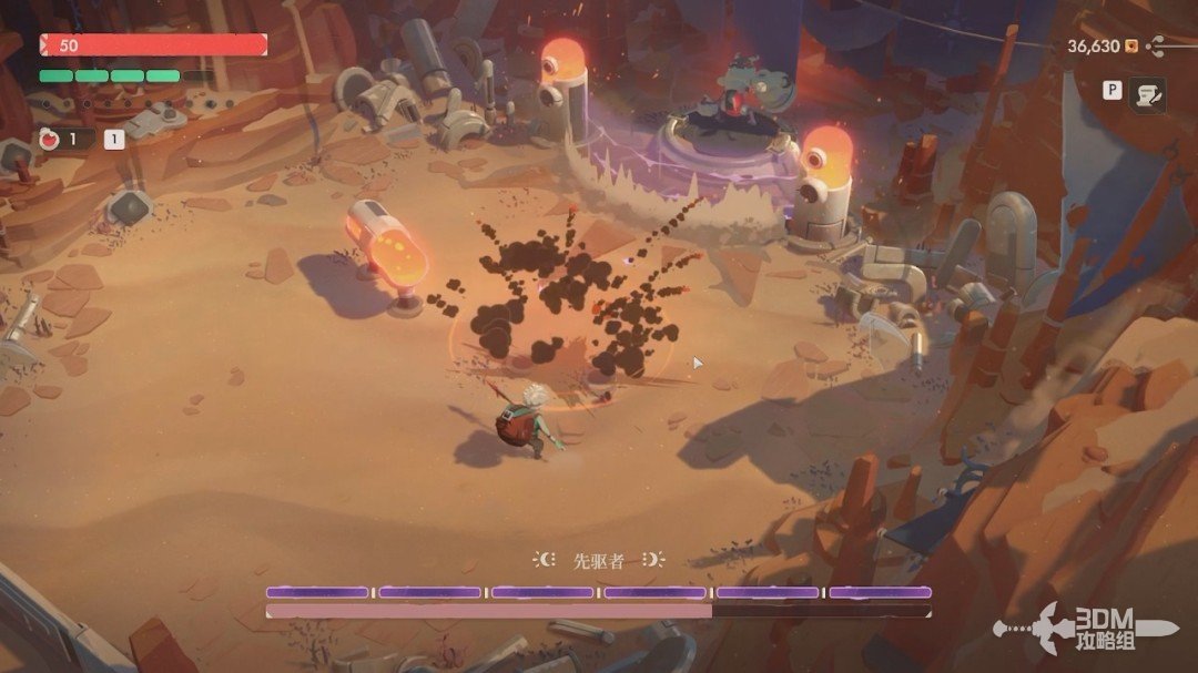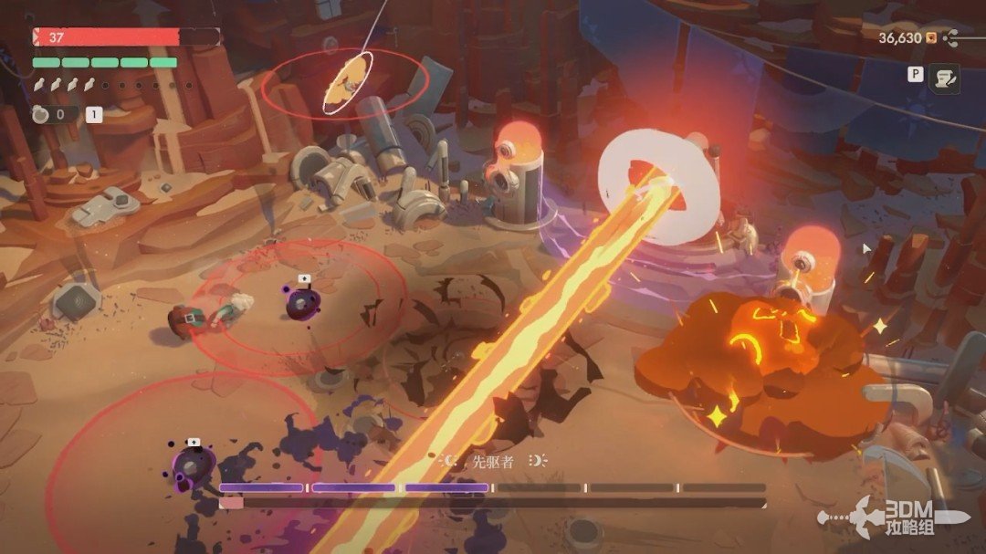 第一关的BOSS是先驱者。开局我们无法对它造成伤害,它有紫盾。我们先躲避它从天上抛下的炸弹和激光,激光站在这两个罐子后面躲避。