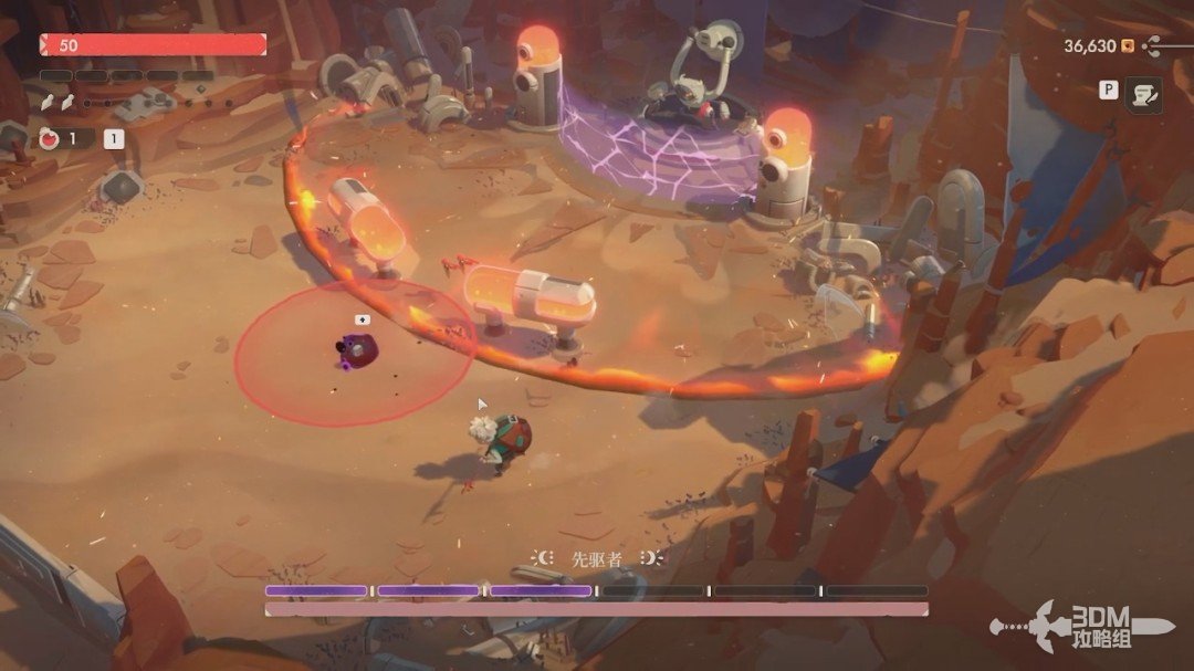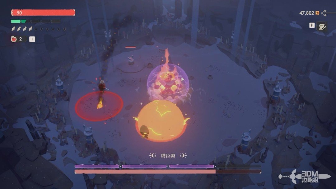 这次只需要打掉三次盾它就会解除这个紫盾状态。出来后它还是会使用冲撞,不过这次冲撞会在原地留下火焰,需要注意一下。