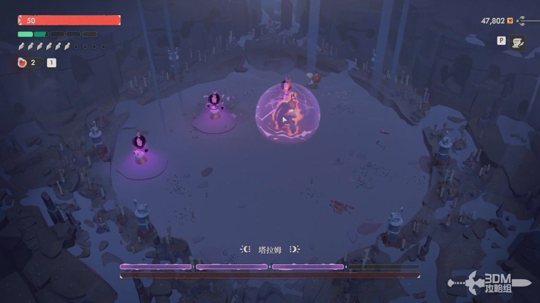 接着会继续下砸几次,随后它会出现在中场展开紫盾。我们要躲避它的震波,顺便靠近旁边的“烛台”,打掉以后会变成紫火,然后和之前一样按SHIFT键打回去破坏紫盾。
