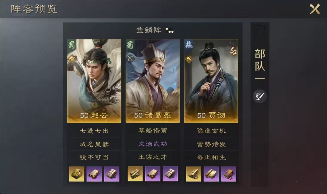 配队推荐以赵云、诸葛亮为核心构成三核体系:赵云承担前排承伤与突击输出,诸葛亮提供群体控制与智力增益,贾诩则负责节奏干扰、状态覆盖及团队续航支持。兵种专精建议选择“袍泽同心”,当贾诩为友军施加治疗时,有60%概率额外恢复兵力,进一步放大其辅助效能。
