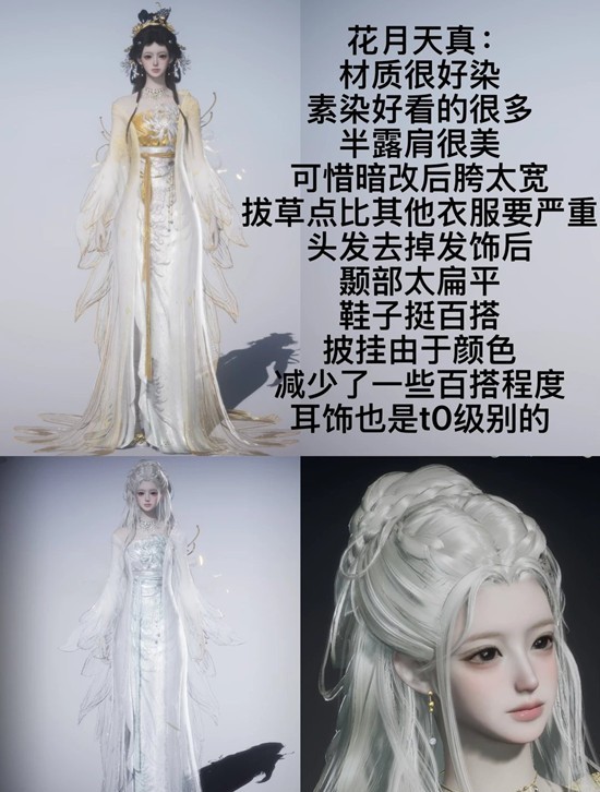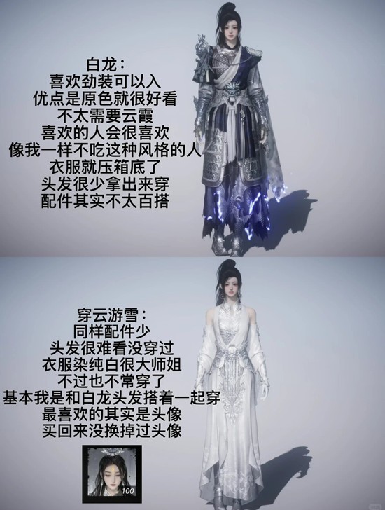 穿云游雪:同样配件少,头发很难看,没穿过衣服,染纯白很大师姐不过也不常穿了,基本我是和白龙头发搭着一起穿,最喜欢的其实是头像,买回来没换掉过头像