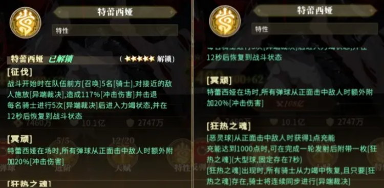 特蕾西娅拥有阶段化输出节奏设计:战斗初始即在前排部署5名骑士,对靠近的敌人发动“裁决”,每次造成117%冲击伤害;单体骑士连续执行5次裁决后进入12秒力竭冷却。其被动“冥顽”赋予队伍关键增益——当自身在场时,所有弹球从正面命中敌人,均可额外附加20%冲击伤害。